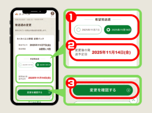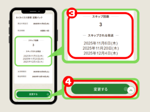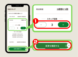 また、「発送曜日の変更」「発送週の変更」「発送スキップ」ができます。