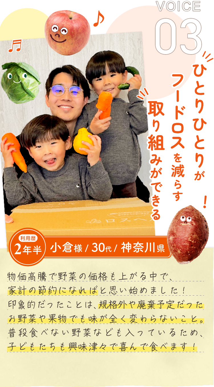 国が定めている農薬使用量、頻度、成分を下回る、残留農薬の心配がない規格外野菜(正規品含む)のみ取り扱いします。